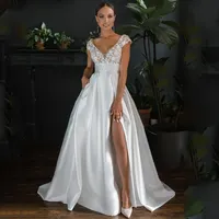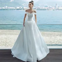 주문을 받아서 만들어진 2025 최고의 프랑스 새틴 칼집 웨딩 드레스 간단한 Vestidos 떨어져 어깨 짧은 소매 흰색 신부 가운