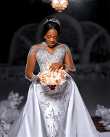 이동식 꼬리 새틴 스커트 전체 소매 버튼 백 신부 가운과 맞춤형 무거운 크리스탈 비즈 인어 웨딩 드레스